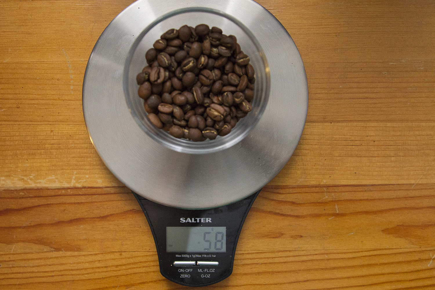The reason I say 60-ish grams is because I took so long to take this picture that my scale had ample time to change it’s mind from 60 grams to 58 grams. But that kind of precision doesn’t really matter, and my scales are rubbish anyhow. What matters more is that you get a ballpark figure so you know where you’re at and where to go if you want to change anything. This also makes it easier to hit the same sweet spot later if you brew turns out perfect.