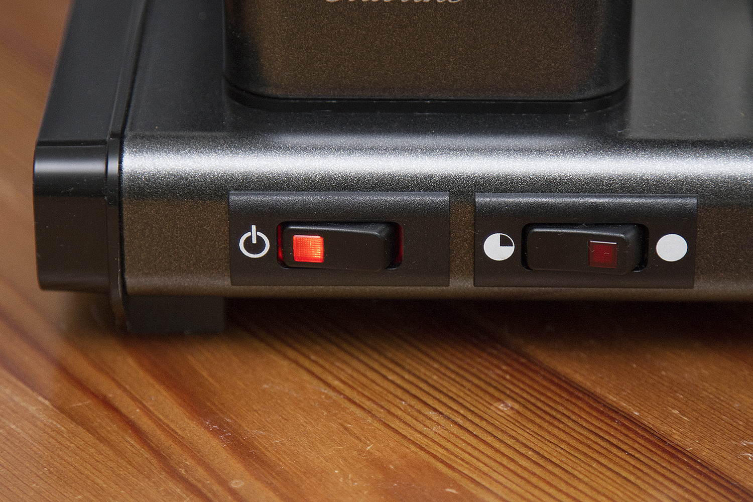 There we go, chuck that in the filter holder, and assemble the whole shebang. Now we have everything in the machine and are ready to go. But, before that, the second and final thing specific to Technivorm brewers. Notice that on the side of the machine there are two switches. One starts the machine, but the other, the pac-man / no pac-man one, is not as self-explanatory. This is the hot plate setting, and basically it’s either hot or very hot. This button should never be on anything else than the hot setting, i.e. pac-man mode! The reason is that the hot plate already slowly destroys your coffee as it sits there slowly stewing, but on the very hot setting it will cook the living daylight out of it before it’s done brewing. To really push this fact home, here’s a picture of the switches in the only allowed mode while brewing! The very hot setting might do as a stove for frying eggs in a pinch.