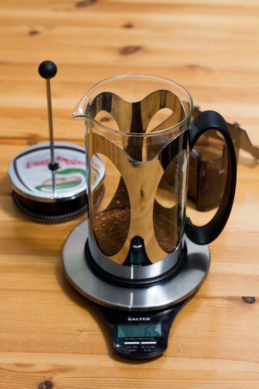 Start by measuring out 65 grams of coffee grinds for 1 litre of water. The rule for good coffee is approximately 60 grams of coffee per litre of water, +/- 10 grams depending on grind size and the particular coffee and how it’s roasted.