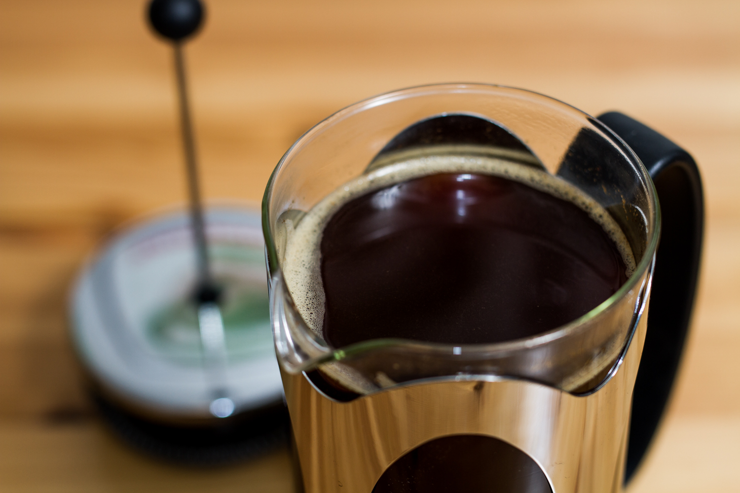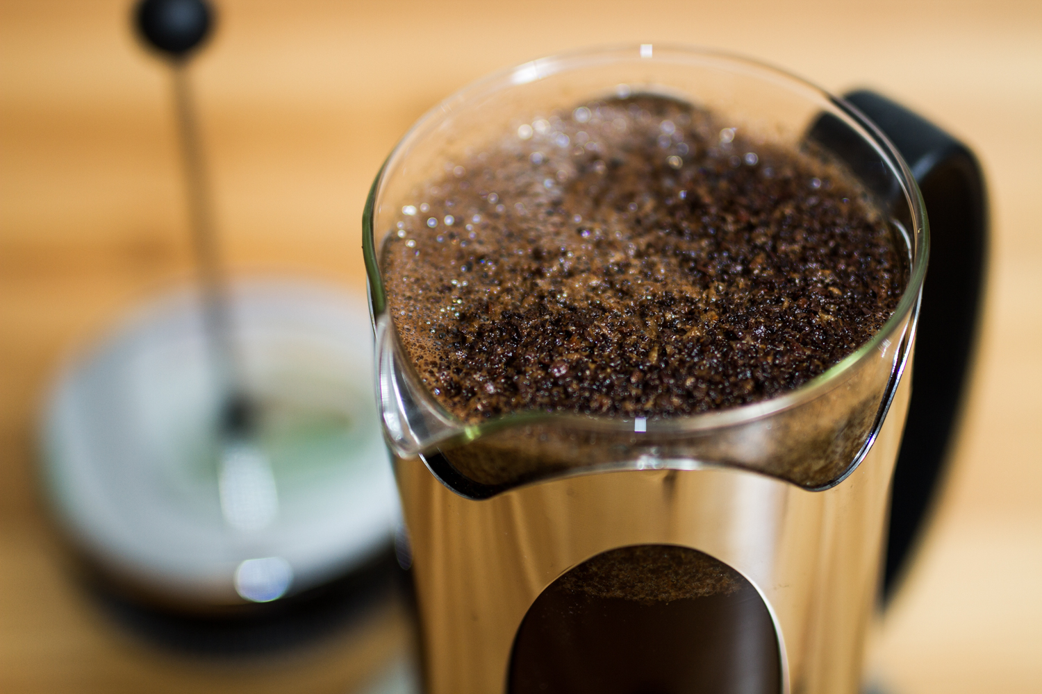 Here you can see the bloom that has formed on top of the coffee. Let it sit and brew for 4 minutes and 30 seconds. After the brewing is done, we’ll move on to a trick that really makes the difference between good and great French press coffee.