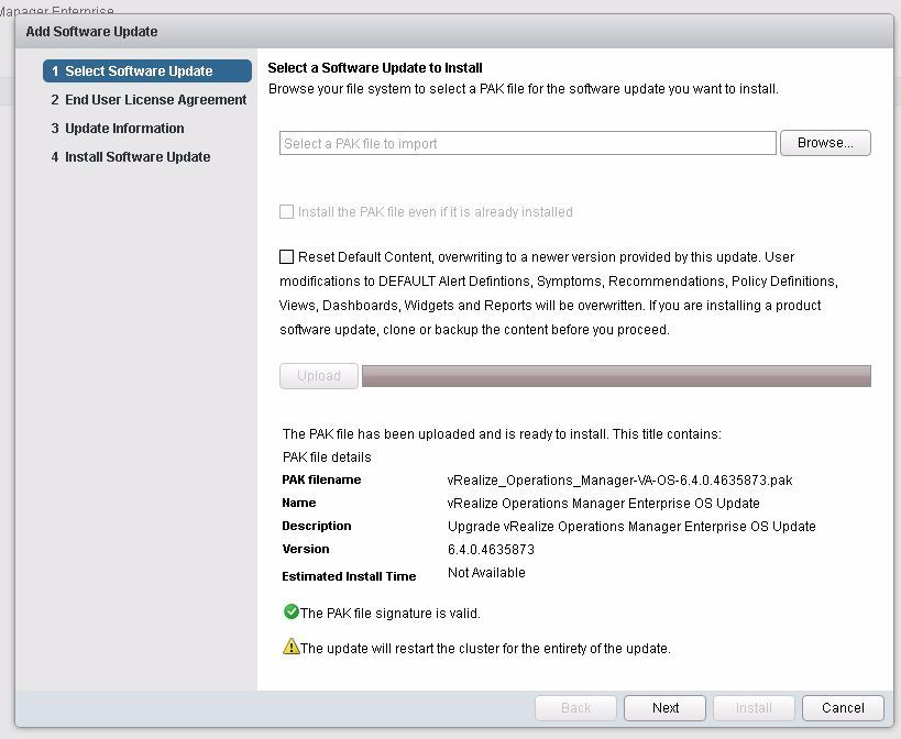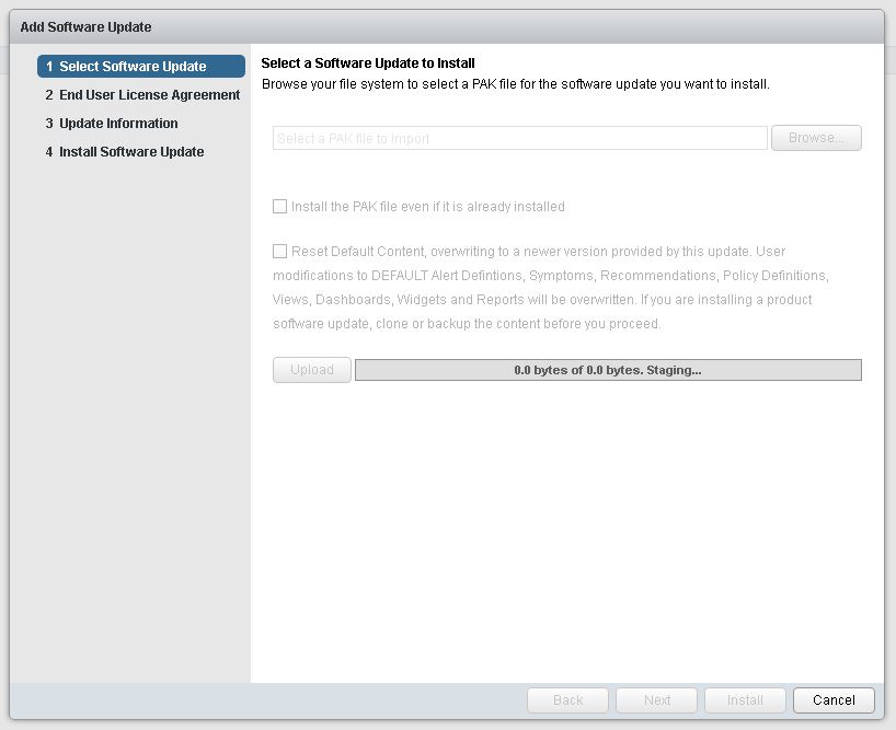 Select and upload the appliance patch (helpfully named named vRealize_Operations_Manager-VA-VersionNumber.pak.). The upload and staging process are the same as in Step 3, and Staging takes forever this time as well.